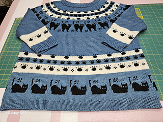This sweater is worked seamlessly from the top down. First the stranded yoke is worked, then short rows are added to shape the back of the shoulders. The body and sleeves are separated and worked in the round. (3/4 sleeves)