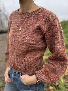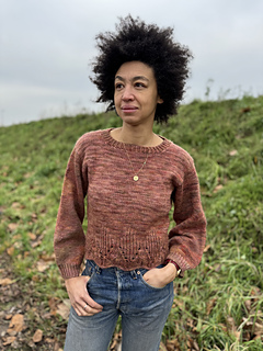 A bottom-up modified drop-shoulder jumper, featuring lace details and twisted rib designed to hug the waist.