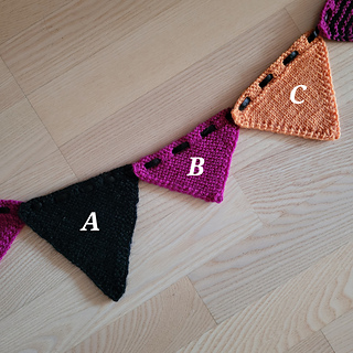 Triangles A and B are knitted in garter stitch and triangle C is knitted in stockinette stitch.