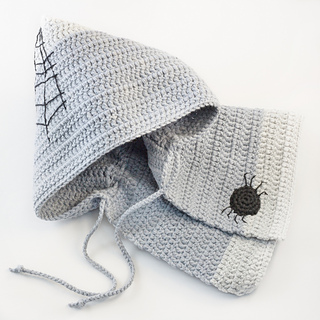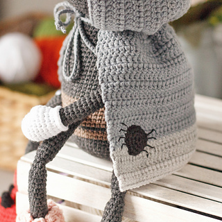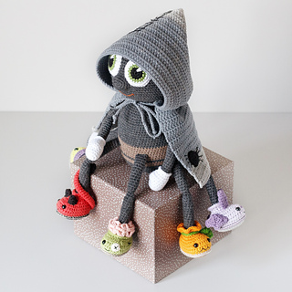- yarn: Sport weight yarn 4ply in black and brown colors for the spider’s body, gray color shades for the hooded cloak, and different colors for the rest of the details. Used yarn: YarnArt Jeans 160m/50g, Alize Cotton Gold 330m/100g