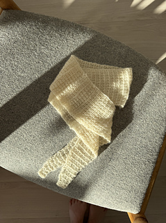 Materialer: 33 g Cashmere Premium fra Lang Yarns (25 g = 115 m), eller 33 g Cardiff Cashmere Classic (25 g = 112 m), eller 22 g Alva fra Filcolana og 19 g Soft silk mohair fra Knitting for Olive, eller 16 g Cashmere lace fra Gepard Garn og 25 g Alpaca 2 fra Isager Garn, eller 28 g Cashmere Classic fra Gepard Garn