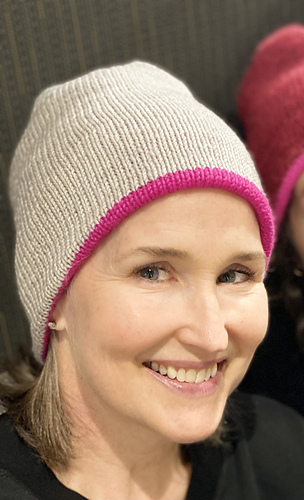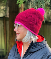Calls for two contrasting skeins of heavy dk or light worsted for the pattern -- 20 stitch for 4 inches gauge. We used Cadence with Cashmere from Hazel Knits for one sample hat and Elmer and Birdie held double from Lamb and Kid for the other hat shown in pattern.