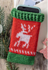 phone cozy with elk design in green red and white.