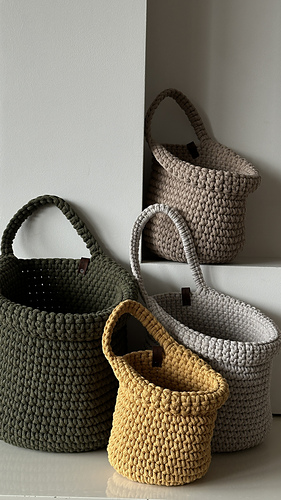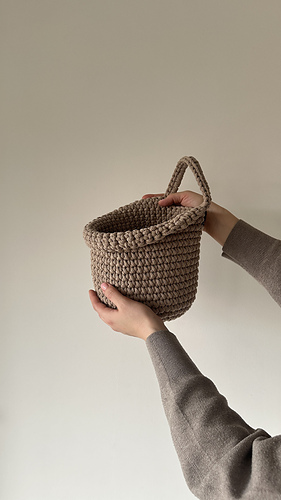 The size of the basket I made from the pattern is the diameter (bottom) = 17 cm/ 6.75’’ and the height (walls) = 20 cm/ 8’’.