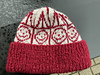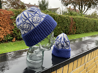 Happy hat er i en lille børnestørrelse og en voksenstørrelse. Strikket i uldgarn til p. 3,5-4. Den er lavet med en bred rib til omslag og i mønsterstrik, der skal strikkes lidt fast. Brug 1(2) nøgler rib til rib og mønster og 1 nøgle til bundfarve. Uldgarn der løber ca 100m på 50g.