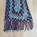 Happy Trails to You is a crocheted asymmetrical shawl that has a unique shape. It is worked sideways in an easy two row repeat that is finished with a twisted fringe edging. Pattern is written for 328 yards of sport weight for the body and 75 yards for the fringe in a different color with a size H crochet hook for a 40” neckline x 30” deep x 69.5” bottom edge blocked shawl. It can be made with any weight of yarn with a hook size to suit that yarn. Make it any size from a scarf to a larger shawl. A scarf size should take about 150-200 yards of yarn. The four page pattern includes written instructions, a crochet chart, and instructions for making crocheted twisted fringe.