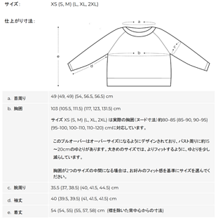 このプルオーバーはオーバーサイズになるようにデザインされており、バスト周りに約15〜20cmのゆとりがあります。
