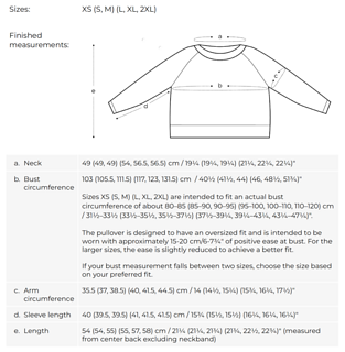 The pullover is designed to have an oversized fit and is intended to be worn with approximately 15-20 cm/6-7¾“ of positive ease at bust.