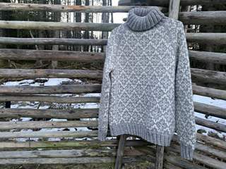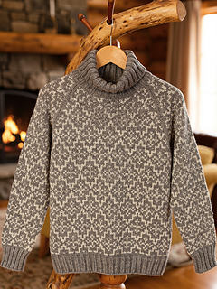 Strikkes nedenfra og opp med raglanfellinger og høy hals