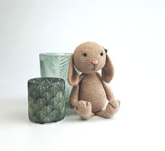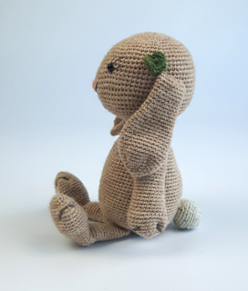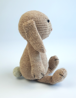 This wool friend is made of sock wool with crochet hook 2.5 and is approximately 16 cm tall when seated. If you like to use a different yarn, that is of course also possible. Bear in mind that Hare becomes (a lot) larger when you use (much) thicker yarn.