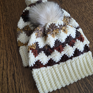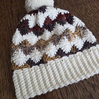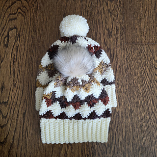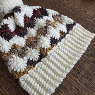Cozy and colorful crochet beanie featuring a beautiful “Harlequin Stitch”.