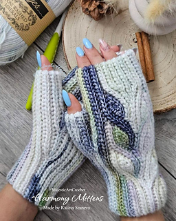 Harmony crochet mittens are made vertically, flat, in one piece, and assembled with a hook. Created using short rows and slip stitches.
