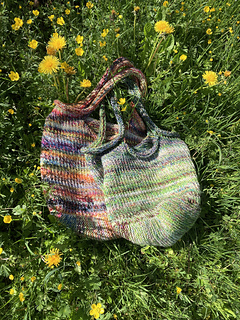 Es wird mit Garn in Sockenwollstärke gestrickt. Das abgebildete Beispiel wurde mit mehr als 20 verschiedenen Resten in unterschiedlichen Mengen gestrickt. Verbraucht wurden beim abgebildeten Beispiel der Tasche ca. 400 g. Ca. 310 g braucht man für den großen Korb und ca. 55 g für das kleine Körbchen.