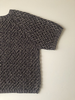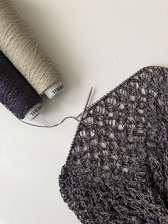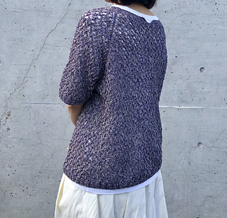 Both yarns used are very thin to knit with on their own, but by holding them together, they become easier to knit with. The thinness of the yarns is utilized to create a light and airy sweater, and the openwork pattern throughout makes it breathable and cool to wear as a summer knit.