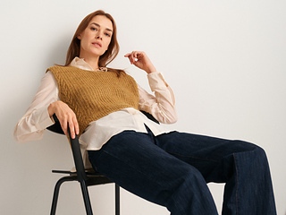 This slipover is worked top-down, beginning flat from the back neck in 2 x 1 Rib and cables while shaping the shoulders using European shoulder shaping. Increases are worked toward the underarm to form the armholes, after which the back stitches are placed on hold and the front panels are worked, including neckline shaping. The fronts are then joined and worked flat to the underarm before being joined with the back to work the body in the round, continuing the textured pattern and cables. The slipover is finished with a twisted-rib hem and i-cord edges at the neckline and armholes.