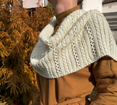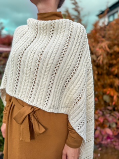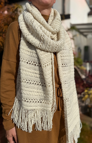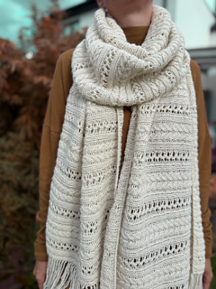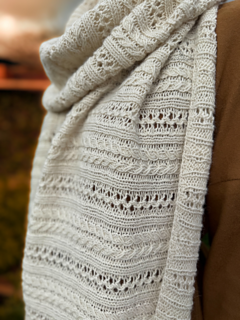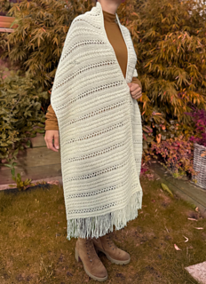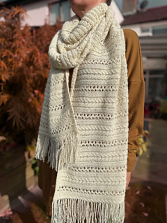 Wrap yourself in timeless texture with this beautifully classic rectangular shawl (50 × 200 cm). The design combines elegant cables with an understated rustic feel, giving a nod to traditional knitting while still feeling fresh and modern. Worked seamlessly in the round, the pattern is easy to memorize and knits up quickly. When finished, a single cut releases the stitches to form a soft, full fringe for extra movement and charm. Knit in DK-weight merino and alpaca blend, this shawl is as cozy and warm as it is stylish.