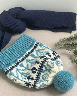 The project uses Drops Nepal yarn in three colors. You will need one skein of two colors and a little yarn of the third color. to make a pompom, you need 25g of yarn.
