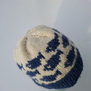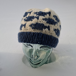 The design is called Stim, which is Norwegian for shoal. The hat is knitted in round, bottom up, starting with a rib.