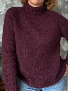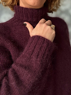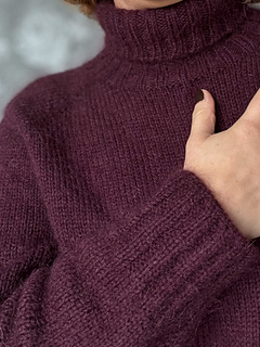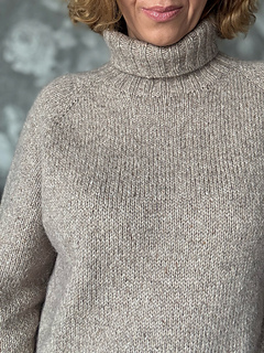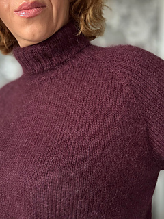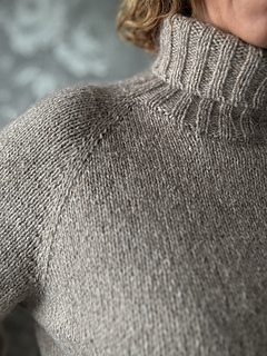 turtleneck, or neckline band. The shoulders have a classic raglan line, achieved through increases. The