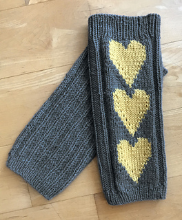 these simple, stretchy legwarmers have 1x3 ribbing most of the way around, with a line of solid intarsia hearts up the sides.