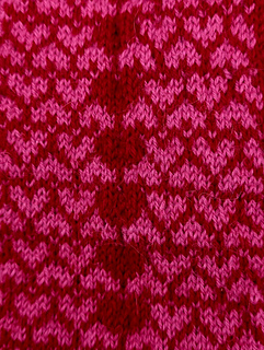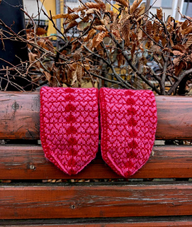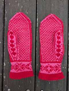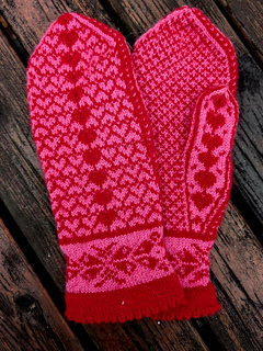 These mittens combine traditional stranded colorwork with a modern romantic motif. Worked in two contrasting shades, they feature an allover heart pattern on the hand, a decorative band around the cuff, and a matching motif on the thumb.