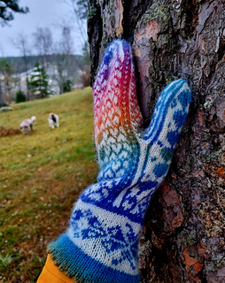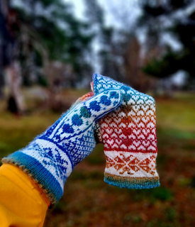 Techniques used: stranded colorwork, knitting in the round, decreases for shaping, thumb gusset.