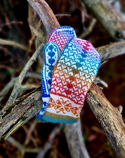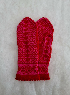 The mittens are knitted in the round from the cuff up, with a thumb gusset for a comfortable fit. The stranded design provides extra warmth, making them ideal for cold winter days.