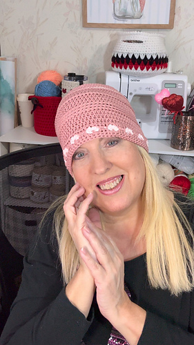 The heart stitch is worked directly into the small turned-up brim, adding a meaningful and feminine detail without adding bulk. The result is a soft, lightweight cap that is comfortable to wear on its own or as a base layer underneath decorative hats, such as cloches or other structured hats with embellishments.