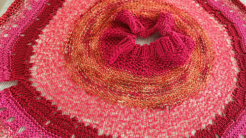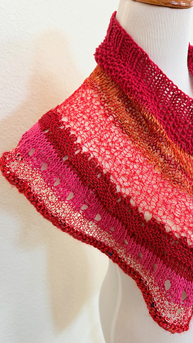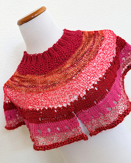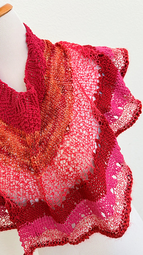 The pattern is fully written and the blocked size measures 20” in neckline, 10” in overall length and 66” along the bottom edge.