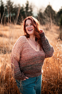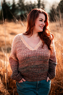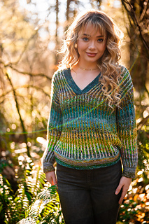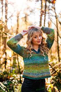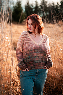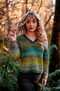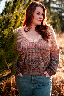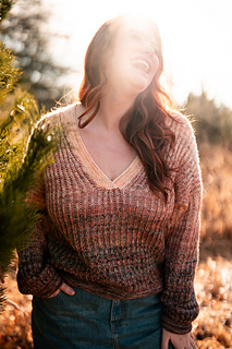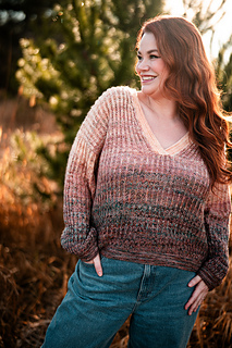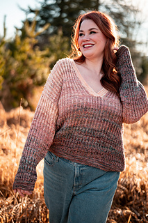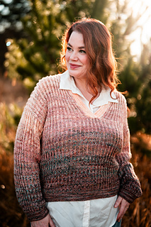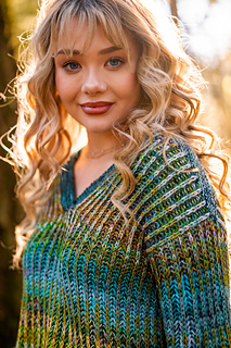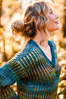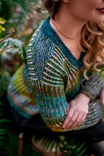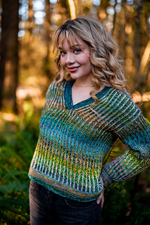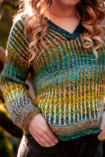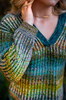 Squishy like it’s cushy cardigan sibling, the pullover leans lighter and more tailored. The garter stitch accents at the hem, cuffs, and V neck are worked with two strands of fingering weight yarn held together, creating a fabric that feels wearable and balanced, while the brioche still brings that signature bounce and depth with marled strands for both the foreground and background colors.