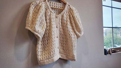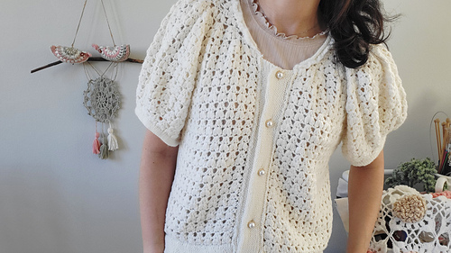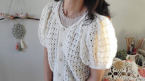 This pattern combines crochet and knitting, is worked top-down, and uses a raglan construction for a comfortable fit. The soft, voluminous puff sleeves and the sparkling heart motif come together to create a lovely and romantic cardigan. The main motifs are crocheted, while the finishing is done with knitting, giving the garment a clean and elegant overall look.