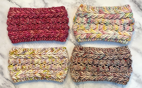 The Hearts and Lace Headband features a lace section surrounded by heart ribbing. It matches my Hearts and Lace Beanie and Cowl patterns. This headband fits all adult sizes S-XL. It is designed for Bulky or Light Super Bulky yarns. Materials needed are either US 11/8 mm or US 10.5/6.5 mm circular or straight needles. I found it easier to knit with circular needles back and forth.
