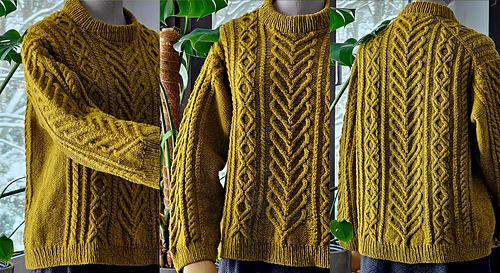 While I love classic Aran garments with dense, tightly worked cables, I often find them heavy and less practical for layering. For this design, I chose yarns and the gauge that create a more relaxed fabric with warmth without weight, making the sweater easy to wear under a coat or on its own during spring and fall. The use of two-tone or subtly heathered yarns further enhances the depth and clarity of the cable motifs, highlighting their texture without overpowering the garment.