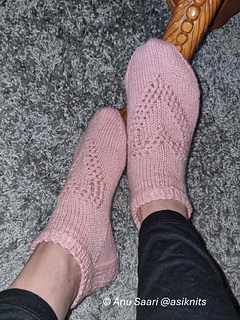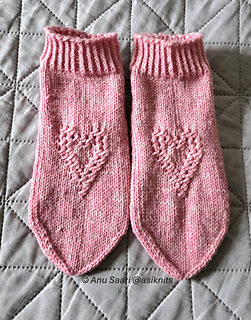 Sydänkuvioita on kaksi, iso ja pieni. Iso kuvio sopii DK-vahvuisella tai ohuemmalla langalla neulottuihin sukkiin. Pieni sydän sopii sukkaan kuin sukkaan.