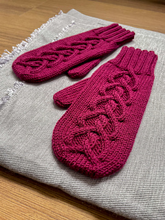 Stitches are cast on and worked in rib for the cuff. The cable chart is then worked across one half, while the other is worked in stockinette. Stitches are increased for the thumb gusset and set aside while the rest of the chart is completed, decreases are worked, and stitches are grafted together at the top. Thumb stitches are then returned to the needles, worked in stockinette, decreased, and bound off.