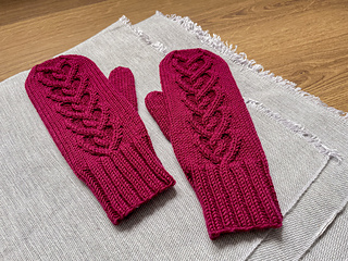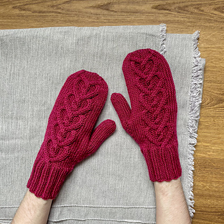 The Heartwood Mitts are a pair of seamless mittens worked in the round from the bottom up. Inspired by their namesake, heartwood - the older, darker wood that provides strength and stability to the cores of larger trees, these mitts feature a neat column of heart-shaped cables flowing up the centre of the back of the hand.