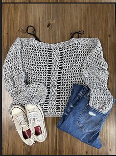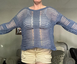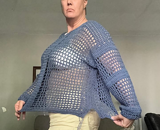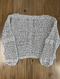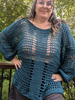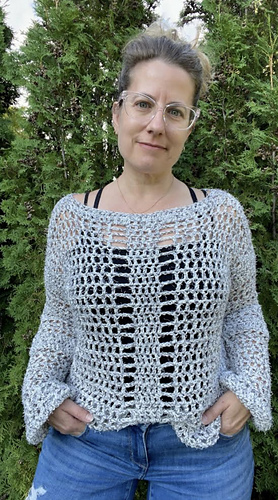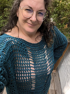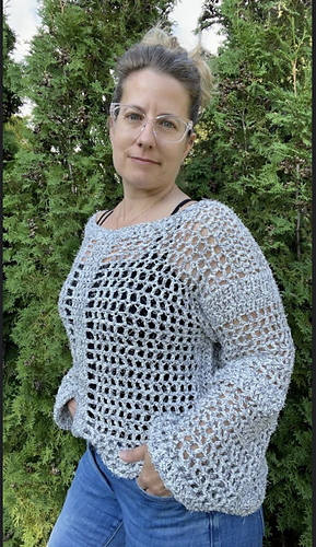 This sweater is a modern take on my younger, slightly goth days, updated for the older better me. The large, open crochet stitches provide visual interest AND air flow, and the long sleeves keep you covered (kind of). I also added a few extra rows to the sides of the body to create the thick, vertical stripes that mimic the front and back while also providing a bit of structure. This sweater is oversized and airy, but not flowy, so it stays put while you’re wearing it.