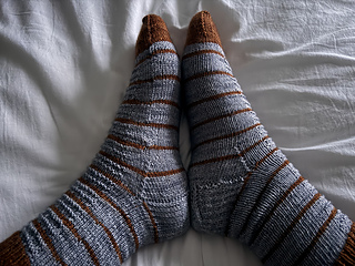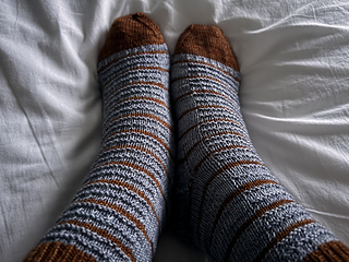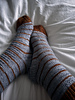 I wanted a pair of socks to use up some of my leftover yarn. These have a textured stitch pattern on the front with stockinette on the back. A few contrasting stripes break up the pattern repeat and add some color to the socks.