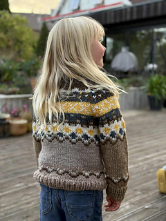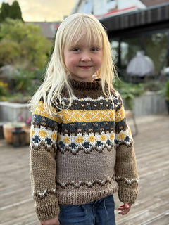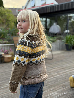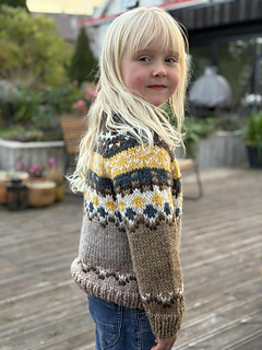 The Helgholm sweater for children is knitted in Rauma VAMS. It is worked bottom-up with raglan shaping. The sweater shown in the photos is size 4 years. The pattern includes sizes from 2 to 12 years.