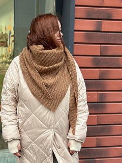 The shawl is worked entirely in a 2x2 rib stitch, making it a simple and relaxing knit.