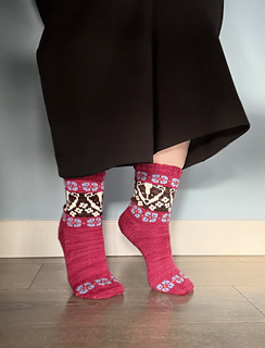 These socks are knit cuff down, increasing stitches and changing needle size for the colourwork to accommodate the less stretchy fabric of stranded knitting. I start with a US1 (2.25 mm) needle and increase to a US1½ (2.5 mm) for the colourwork. The heel is an Eye of Partridge slipped-stitch heel flap and the toe is grafted together.