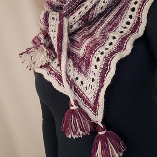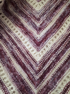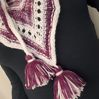 The shawl is knitted with two colors. Sample shawl uses solid white and variagrated purple.