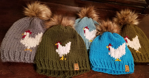 Pattern is written for adult, child, toddler, baby sizes. Beanie was created using Lionbrand woolease thick & quick. Main colour, 4g of chicken body colour, 3- 10” strands for beak, wattle, comb, and feet