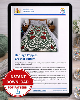 Heritage Poppies is a commemorative mosaic overlay crochet blanket pattern created to honour remembrance, resilience, and enduring gratitude. Featuring bold poppy motifs framed within strong architectural borders, this design captures a sense of reflection and quiet strength while maintaining striking visual impact.
