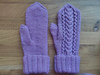 English: The piece is worked in the round with double pointed needles, bottom up. There are cable and lace in this pattern.