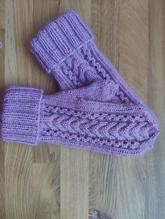 Hertta-lapaset neulotaan ranteelta ylöspäin suljettuna neuleena. Ohje sisältää joustinneuletta, sileääneuletta, palmikkoa ja pientä pitsikuviota. Peukalolle tehdään kiilalisäykset.