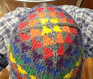 The Hess Hat uses fair isle to create the triangles in the hat. In order to avoid any unsightly jogs at the beginning of each round, the last 1-2 stitches of each round are slightly different to keep the pattern even. Additionally the marker is moved via slip stitches every three rows to keep the pattern looking sharp!