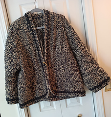 This jacket is styled after the popular hexagon cardigan. It uses a double strand of wt. 4 yarn with very few holes, creating a garment that is cozy and warm.