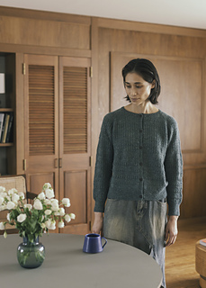 ネックからトップダウンで編む. 襟周りの作り目をしたあと, ラグラン増し目をしながら前後差をつくる引き返し編み, つづけて前襟ぐりをシェイピングする. 脇下までを往復編みで編み, 身頃と袖を分ける. 袖は輪編み. 最後に前立てと襟を身頃から拾い目して編む.