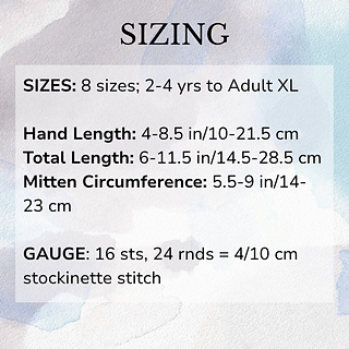 Mitten Circumference: (5.5, 6, 6.5) (7, 7.5, 8) (8.5, 9) in / (14, 15, 16.5) (17.5, 19, 20) (21.5, 23) cm